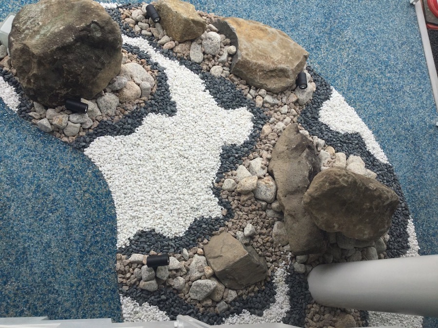 2階には手術室や クリニック バックヤードの他に、院長先生の奥様が経営されるカフェを併設しています。こちらのカフェはモダンな和カフェのイメージに仕上げたいとのことでしたので、ガラス床の座敷下に石庭を施し、また2階カフェへのアプローチとなる階段下にも石庭を設置しました。