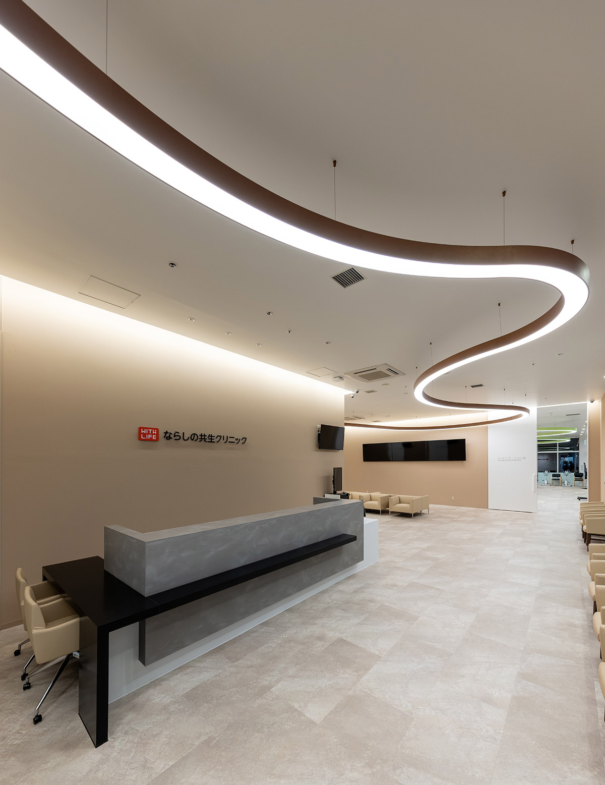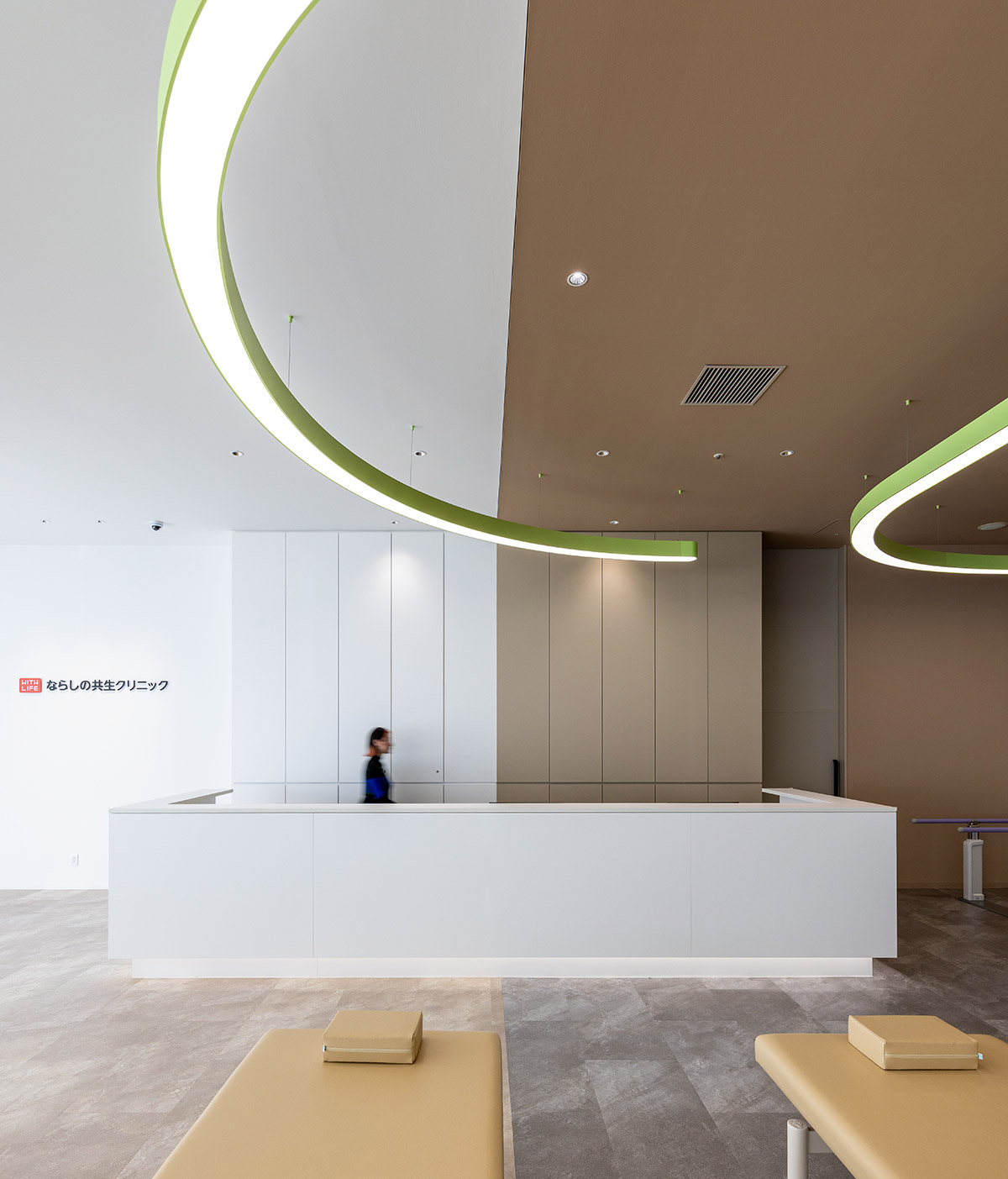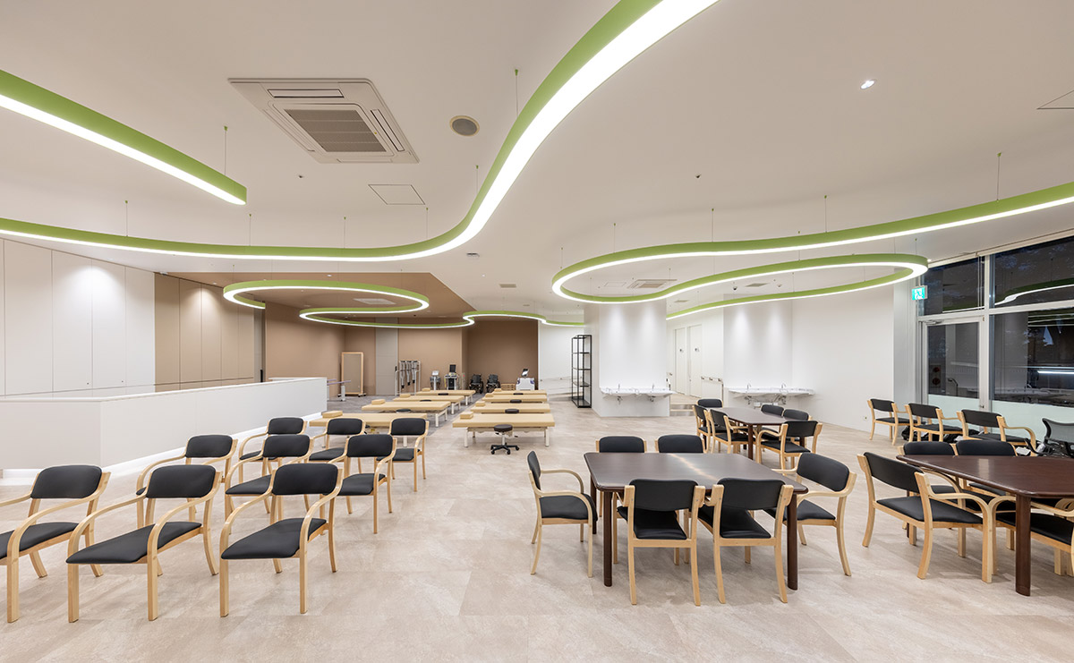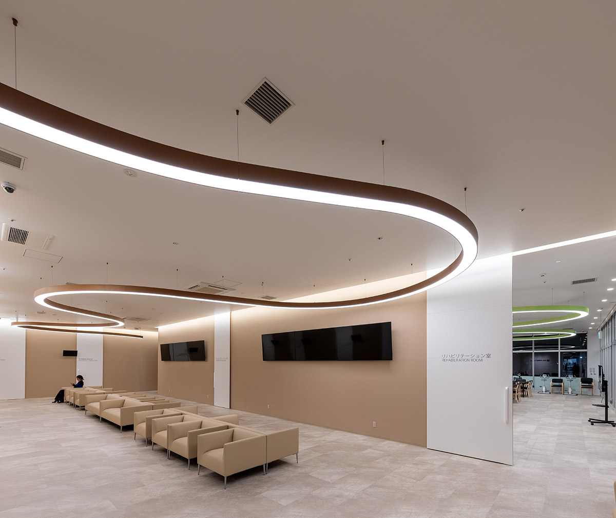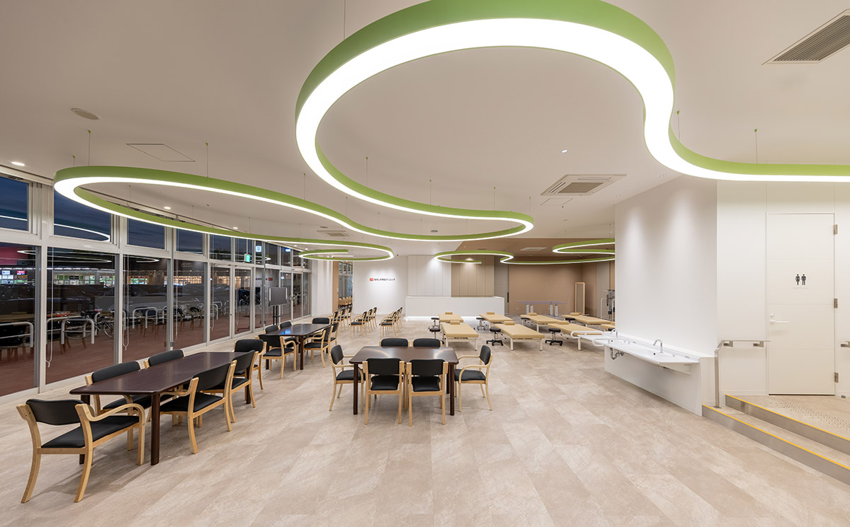 受付から診察、リハビリ、デイケアへと連なる空間を一本の曲線照明で統合し、医療と介護、そして人と人のつながりを空間の骨格として表現している。ミッションに掲げる「医療と介護の壁を壊し、人とヒトをつなぐ」という考え方は、ワンルーム状の広がりと連続する天井意匠によって、領域の分断を感じさせない構成へ落とし込んだ。