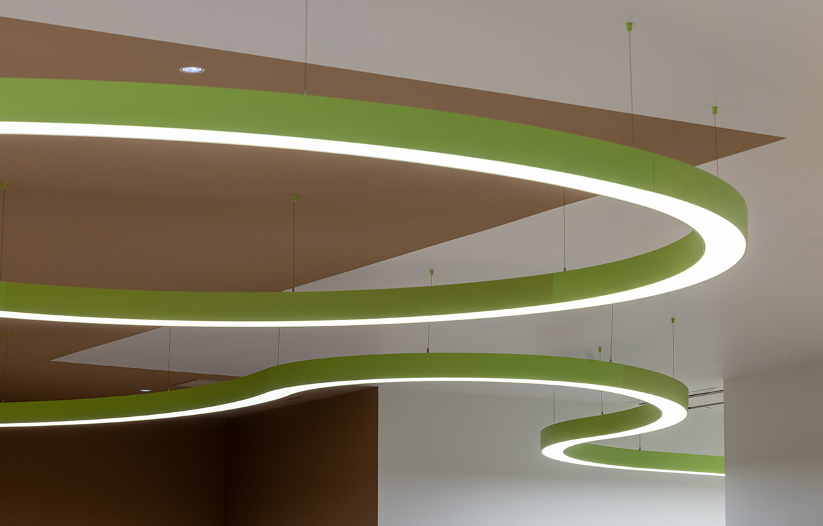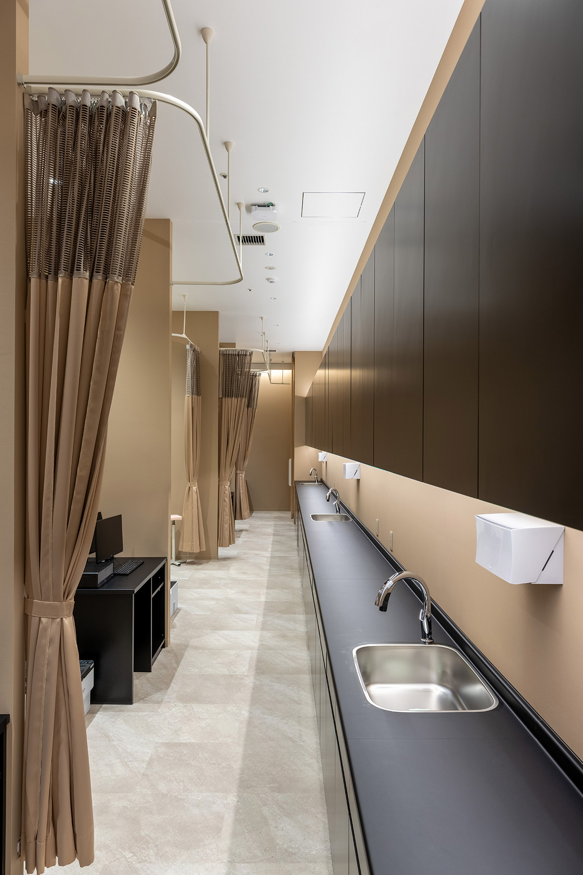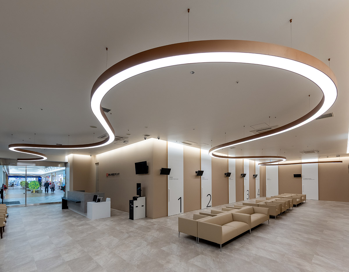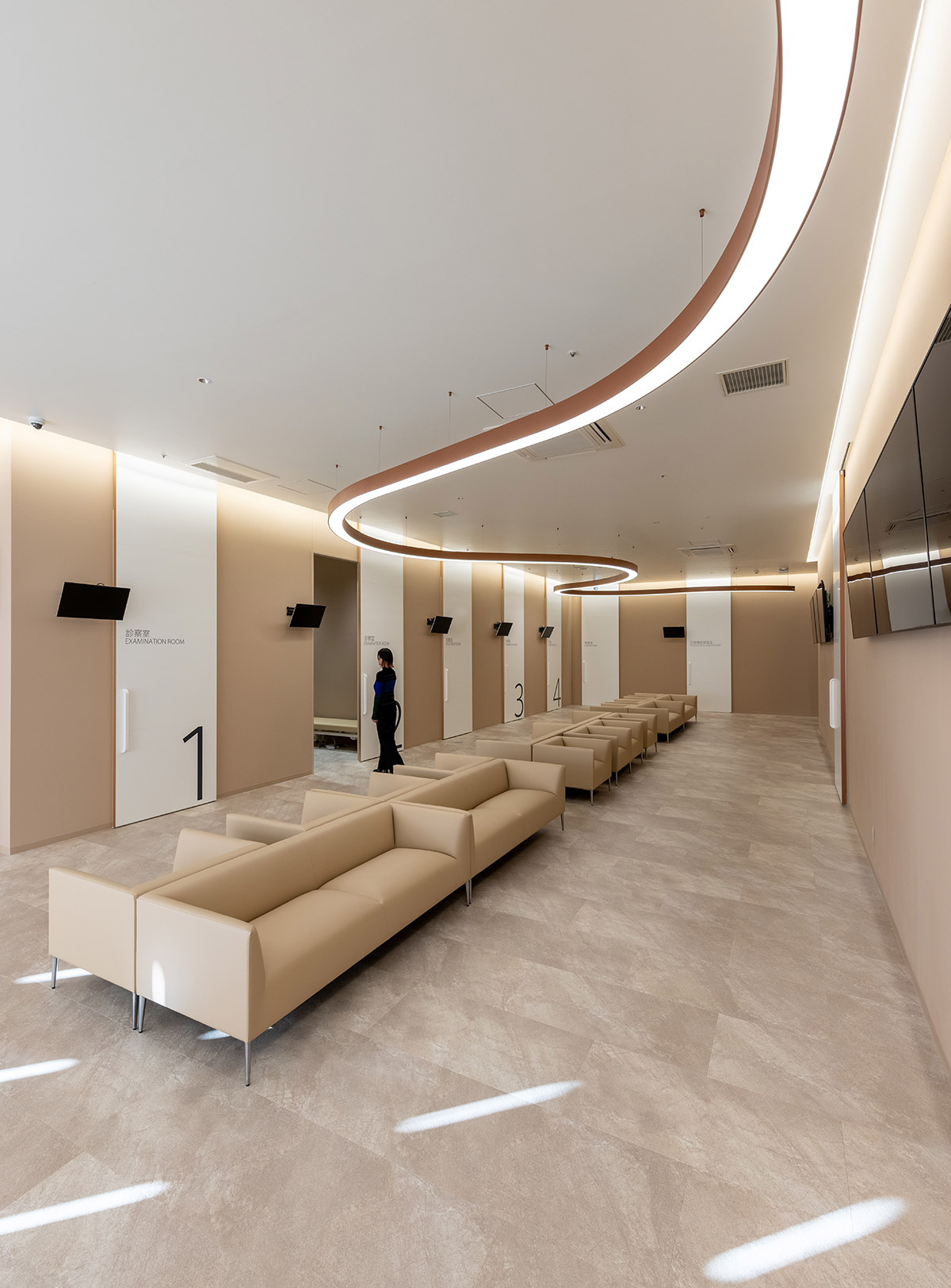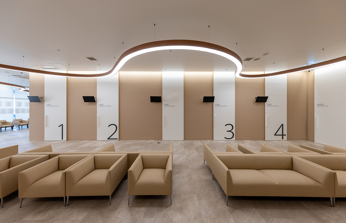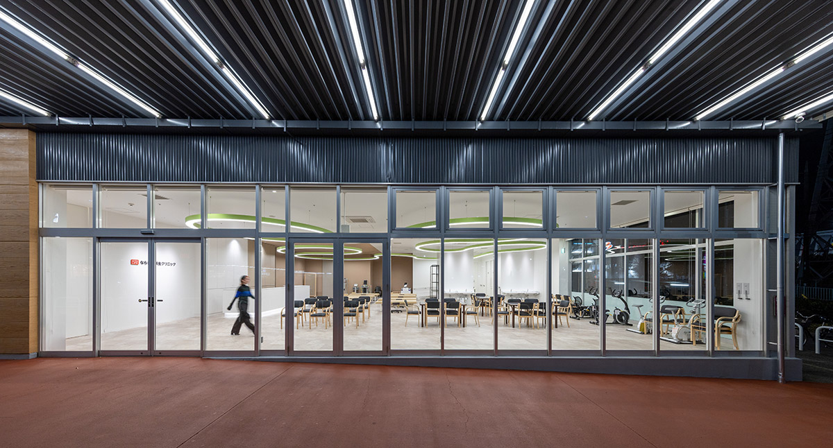 受付から診察、リハビリ、デイケアへと連なる空間を一本の曲線照明で統合し、医療と介護、そして人と人のつながりを空間の骨格として表現している。ミッションに掲げる「医療と介護の壁を壊し、人とヒトをつなぐ」という考え方は、ワンルーム状の広がりと連続する天井意匠によって、領域の分断を感じさせない構成へ落とし込んだ。