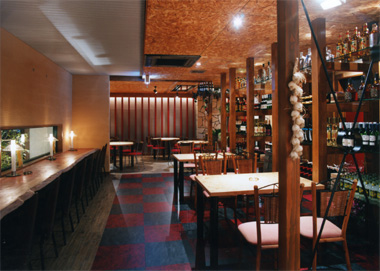 オープンキッチン側から見る客席 右:長方形テーブル席 左:カウンター席 奥:丸テーブル席 |