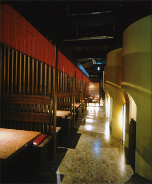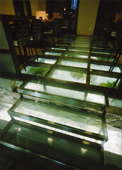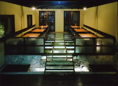 競合店が乱立する地域のロードサイド型の飲食店であり他の飲食店との決定的な差別化が必要であった。 奥行きが長く、幅の狭い物件であったため、厨房、客席、通路は必要最小限の寸法でプランしているが、その狭さのため、店舗に必要不可欠な遊びの空間を作るスペースが無く、店舗の魅力となる要素を床下に配置することとなった。 大きなガラス床の下に川を流したり石庭を配置することにより強烈なインパクトを与える空間を演出し、客は今までに経験したことのない非日常的空間を体験する。 客席ごとに特徴を持たせた演出を施しているためリピート客も多く、昼夜共に満席状態である。 |