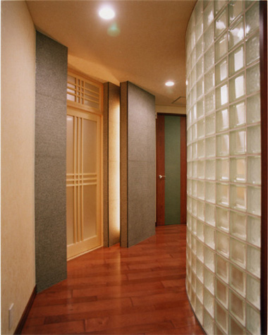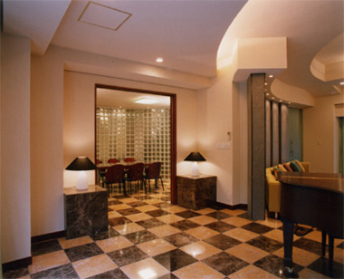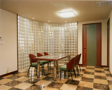 ▲ガラスブロックで仕切られたダイニング(床:大理石貼、床暖房埋込) |
